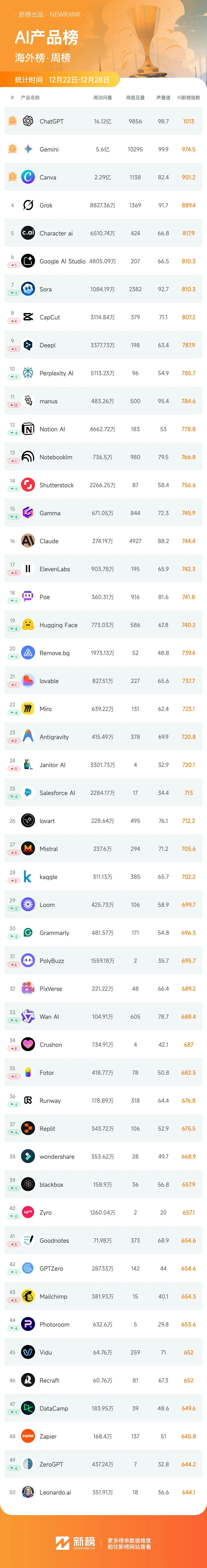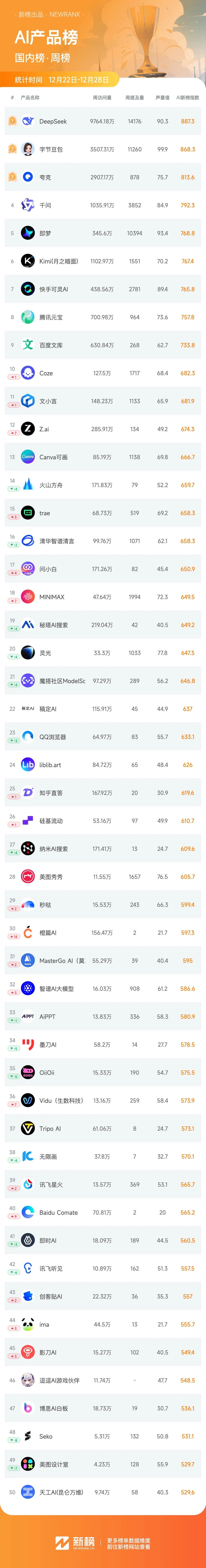 海外方面,Meta宣布全资收购AI Agent明星初创公司Manus,意在补齐其在通用智能体领域的关键拼图,Manus的总榜排名也顺势上升13位。值得一提的是,这场收购虽然验证了Agent赛道的商业价值,但也引发了Meta此举是在为焦虑买单的质疑。
