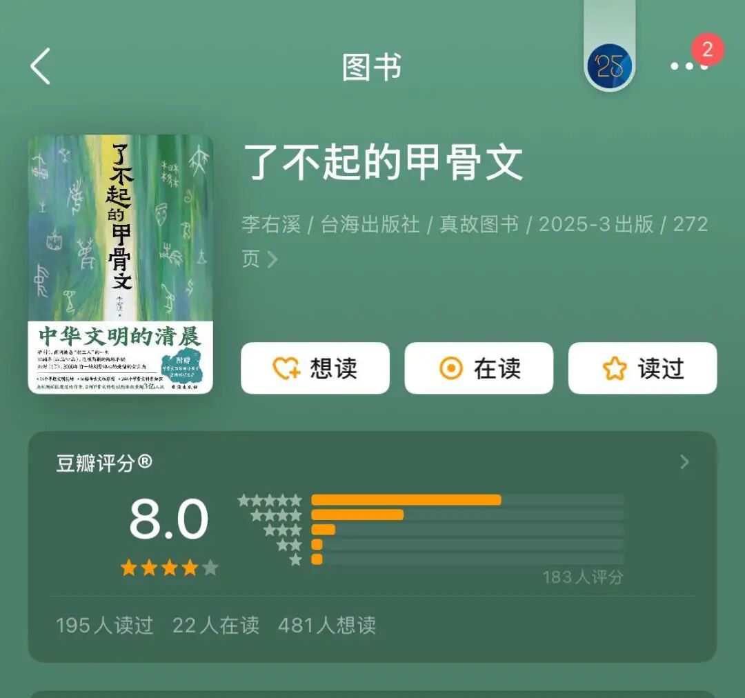 新书发布后收获了销量和口碑双丰收。“李右溪”告诉新榜编辑部,《了不起的甲骨文》目前的销量在4万册左右,在甲骨文品类的书中已称得上是畅销,豆瓣评分也达到了8.0。