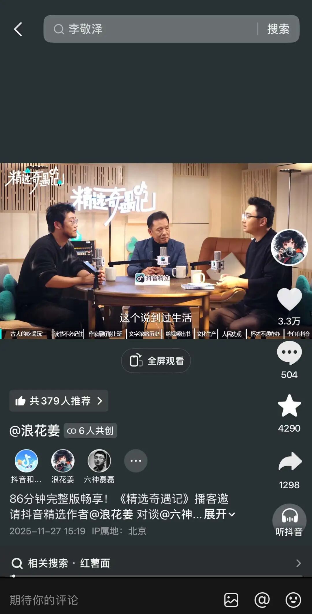 去年11月,“浪花姜”的新书《古人生活与文化图鉴》上市后不久,他便参与了抖音《精选奇遇记》视频播客的录制,和中国作家协会副主席李敬泽,知名作家、文化自媒体六神磊磊一起畅聊古今文化生活。