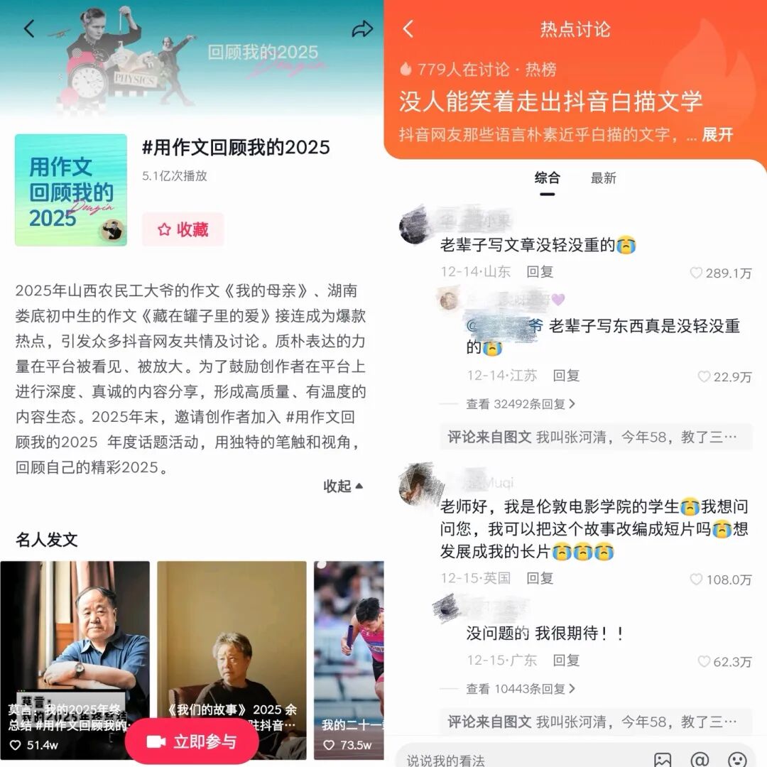 依托长视频、长图文等内容形态,抖音鼓励深度表达与素人写作,比如近期“张河清教授”为好友写下的悼文,“我是柚子”笔下的父亲等,这些长内容的出圈,验证了深度内容的价值,也能成为内容行业源源不断的选题池。