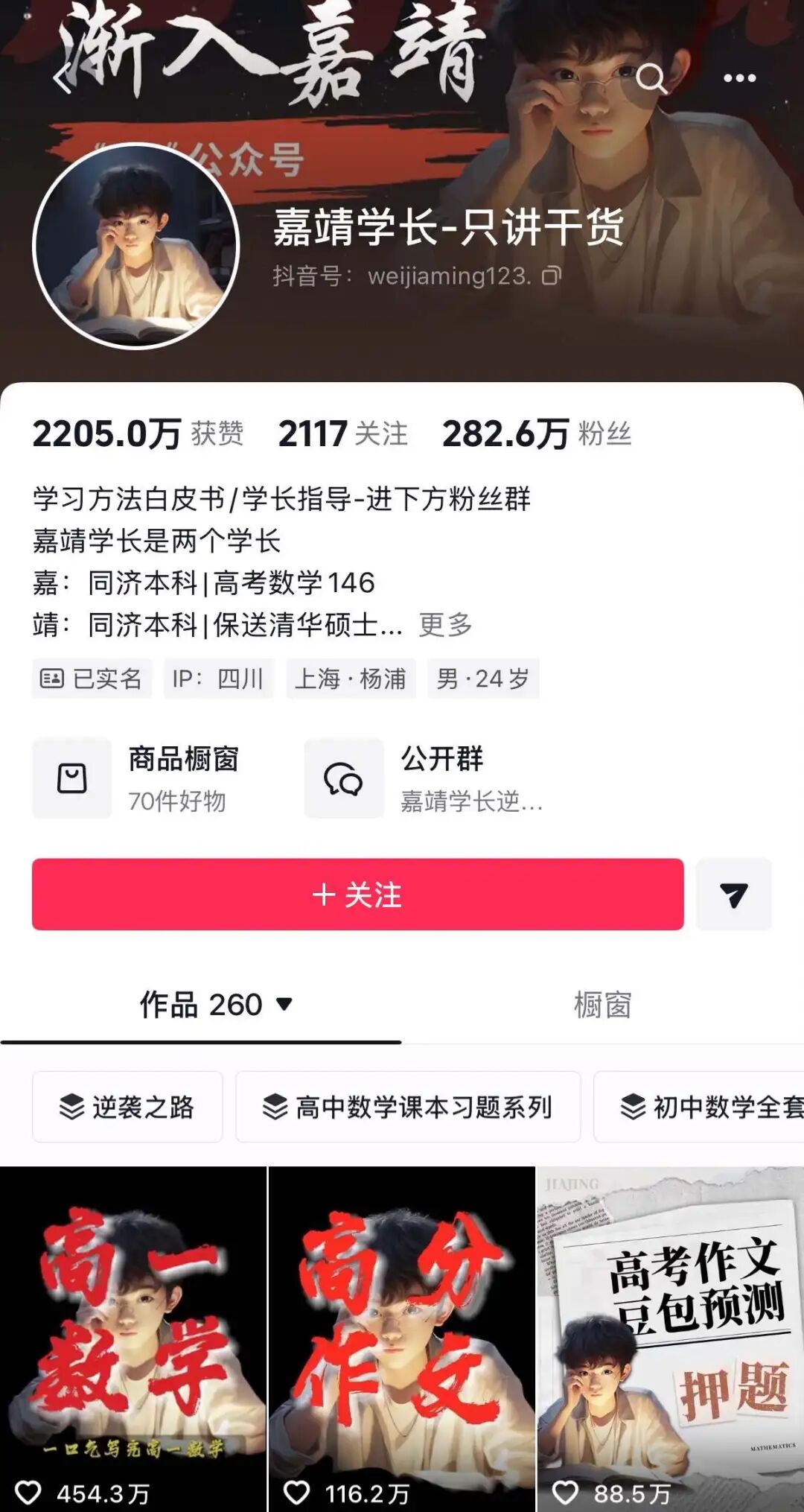早在2021年,刚考入同济大学的魏嘉明结合自己学习路上的经验、踩过的坑,开始在抖音账号“嘉靖学长”中分享学习方法论、题型讲解等视频,并逐渐收获了一批网友的认可。