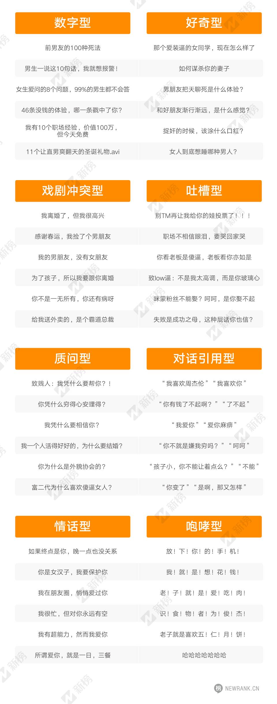 为了让黄小污的技术问答帖显得更加直观,新榜用强大的数据回采和分析功能,调取了咪蒙2015年9月15日至2017年2月27日推送544篇文章的所有标题(其中541篇文章都实现了10w+阅读量),选择了其中有代表性的部分标题进行了归类,供大家观摩吐槽!