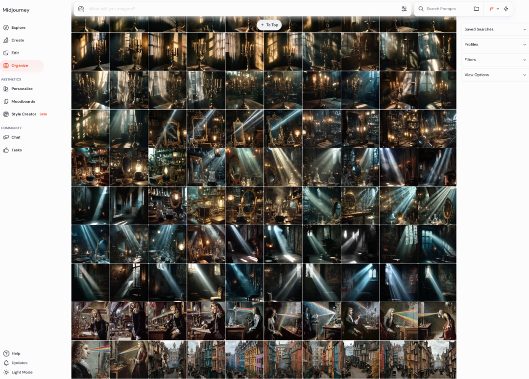 比文字指令更直接、更有效的是参考图。早期团队尝试过欧洲电影的高对比风格,如塔可夫斯基和伯格曼的作品。在Midjourney中将参考图丢给AI,AI学习完并生成满意的样片后,把样片保存下来即可成为后续镜头的参考底图,从而形成属于自己的风格种子。