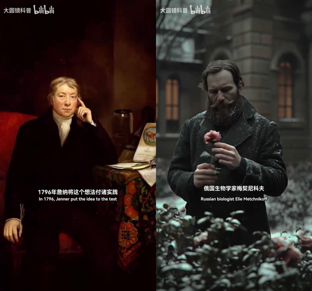 这次挫败让团队意识到,AIGC的核心优势在于为观众提供一种全新的、更具沉浸感的科普内容。正如爆火的《免疫的阴影》所呈现的,AI能瞬间带观众回到19世纪,也能让创作者在7分钟内横跨多个时代、对话数位科学家。这在传统影视工业中需要天价预算和漫长周期,而AI却能以低成本高效实现同等质量的内容。