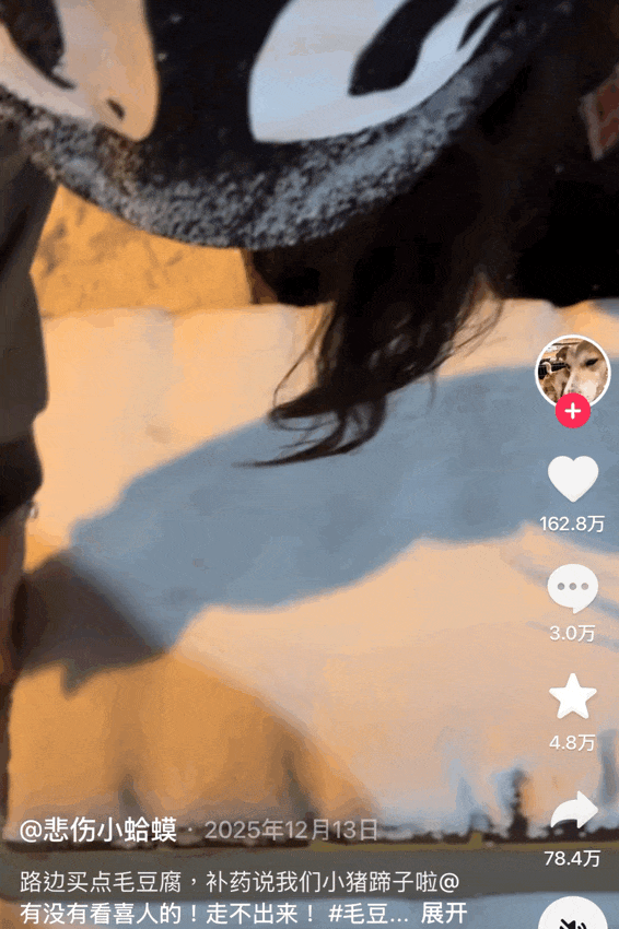 这天抖音创作者“悲伤小蛤蟆”发布了一条在公园长椅上用积雪做霉豆腐的视频,获赞超162万,转发超78万。不少网友在评论区留言,“还以为就我一个人爱看”“第一句话出来我就知道考点了”。