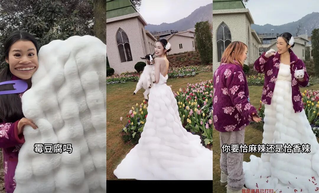 积累了一波原始流量后,霉豆腐的风还吹响了时尚圈。时尚博主“氧化菊”以霉豆腐为灵感,穿着一板霉豆腐一条白色绒裙拍摄变装视频,并在结尾彩蛋中演绎“你摸了我还怎么卖啊”这一经典课件。
