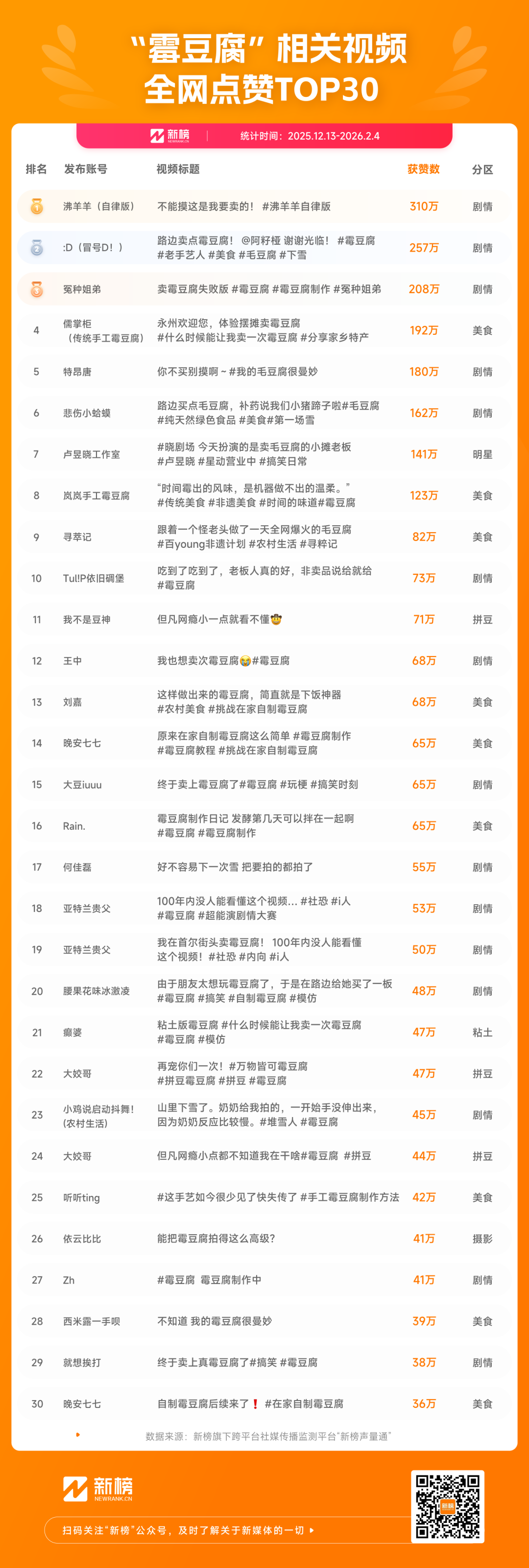基于此,我们拉取了2025年12月13日至2026年2月2日以来全网获赞最多的30条视频。