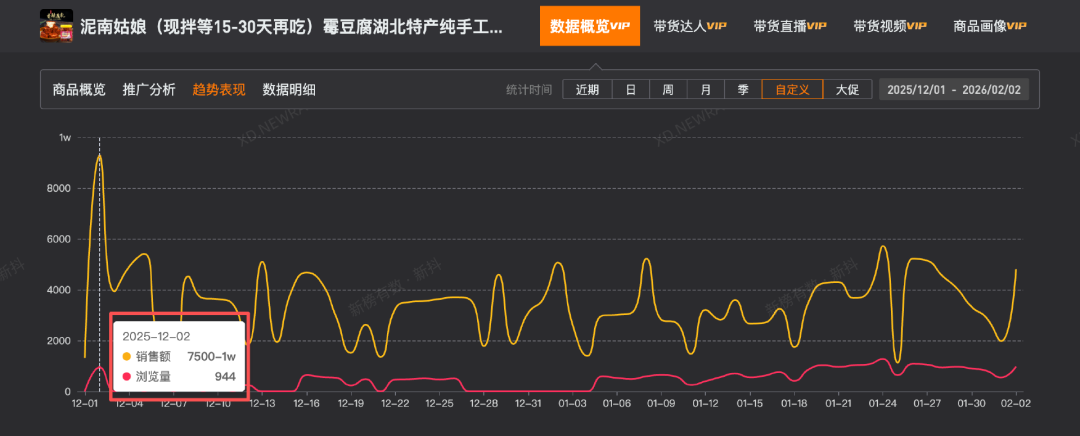 以全网粉丝数最高、统计周期内视频获赞最多的霉豆腐摊主“泥南姑娘”为例,新榜旗下抖音数据工具新抖显示,她主要售卖的现拌霉豆腐,近30天内浏览量增多,但销售额并没有明显上涨。