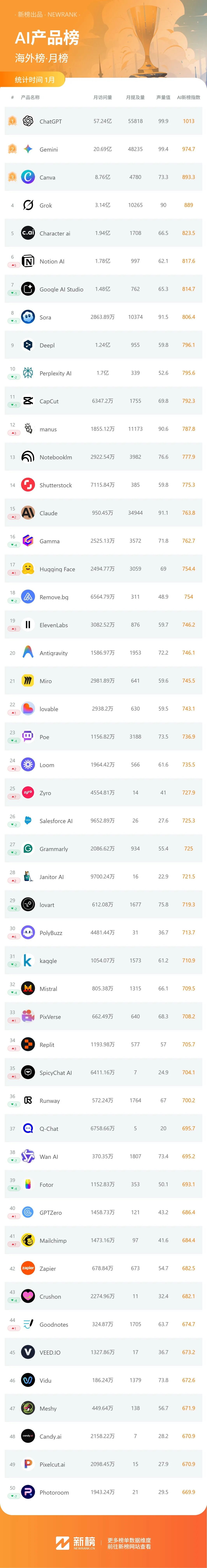 另外,Notion更新3.2版本,移动端增加AI笔记功能和Agent代理,在海外榜排名上升5位至第6。AI视频产品Veed.io移动端App支持生成含AI角色或配音的产品演示/讲解视频,总榜排名上升35位。