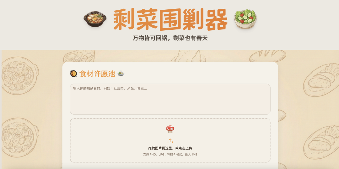 主界面的屏幕中央是一个食材输入框,只让你做两件事:输入你剩下的食材(比如烤鸭架、半个洋葱、吃剩的凉拌菜),并选择你今天的“口味心情”(比如想吃辣、想解腻、想喝汤)。