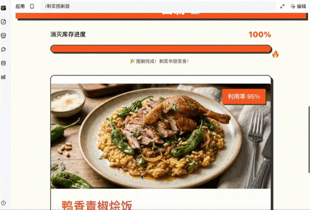 点击“开始围剿”后,屏幕会生成一张“创意料理卡片”,正面是AI生成的成品图和名字,别说剩菜被AI一美化,看着都有食欲了。