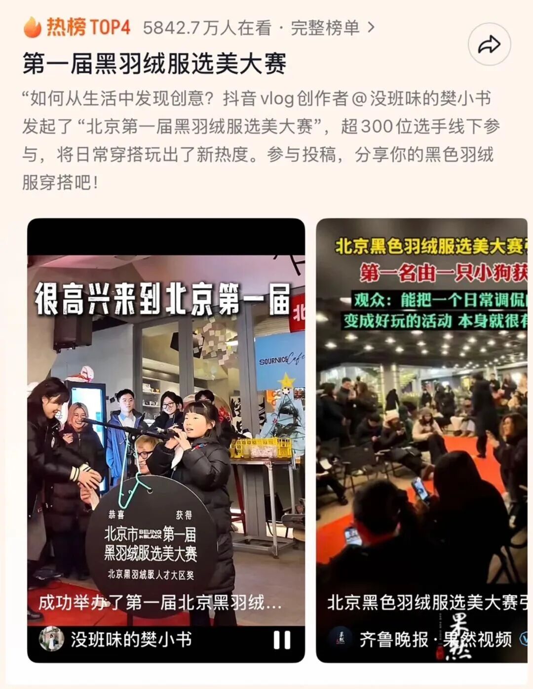 在抖音,黑色羽绒服选美大赛的相关视频播放量迅速攀升,樊小书所发布的大赛视频点赞量达92万,有人感叹活动的活人感十足,也有人建议在新城市开启不同主题的大赛。