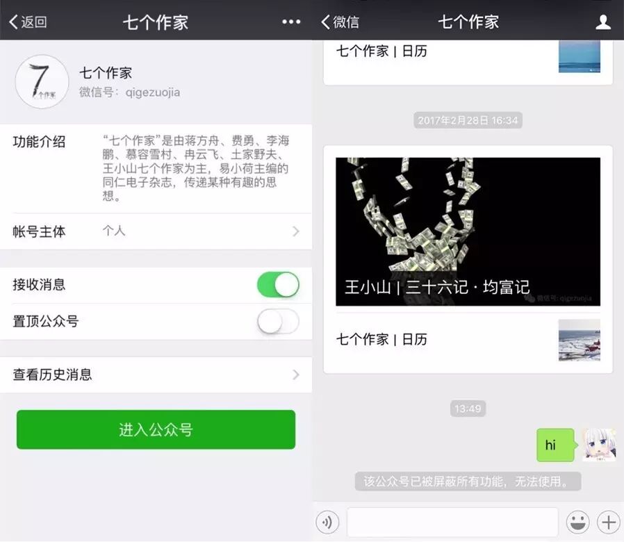 新榜讯 3月2日,榜妹发现公众号“七个作家”被屏蔽了所有功能,历史消息已无法查看,目前通过微信名称或ID已无法查找到该公众号。根据微信官方给出的封号提示,经核实,该账号涉嫌违反相关法律法规。