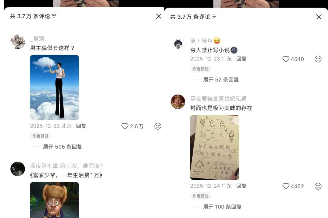 截至目前,这条视频在小红书的点赞和收藏量均超过10万,在抖音的点赞量超279万,评论区有网友调侃“都说了别让穷人写豪门小说”,还有人总结男女主是“竹节虫校霸和拾荒者女主的爱情故事”。