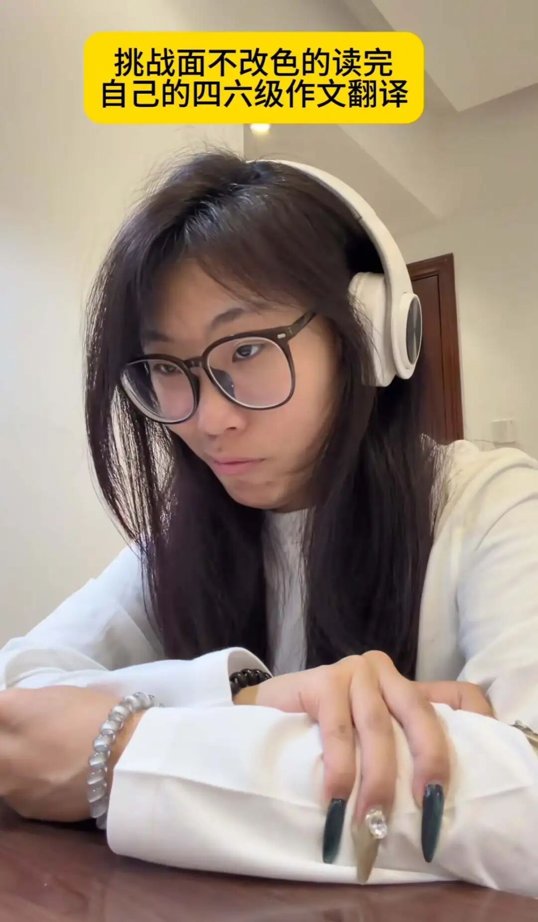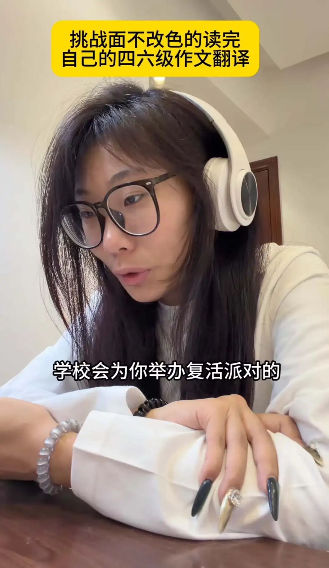 视频中,她挑战面不改色读自己的四六级作文翻译,题目是代表全班同学去探访受伤的Peter老师。