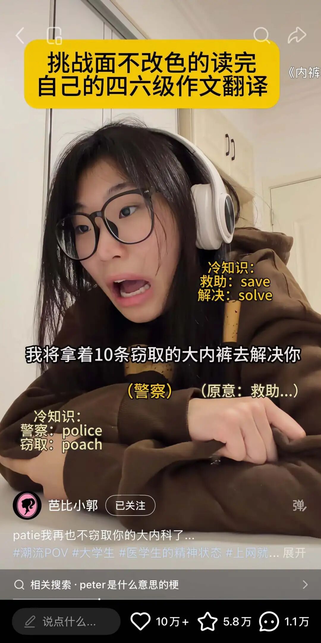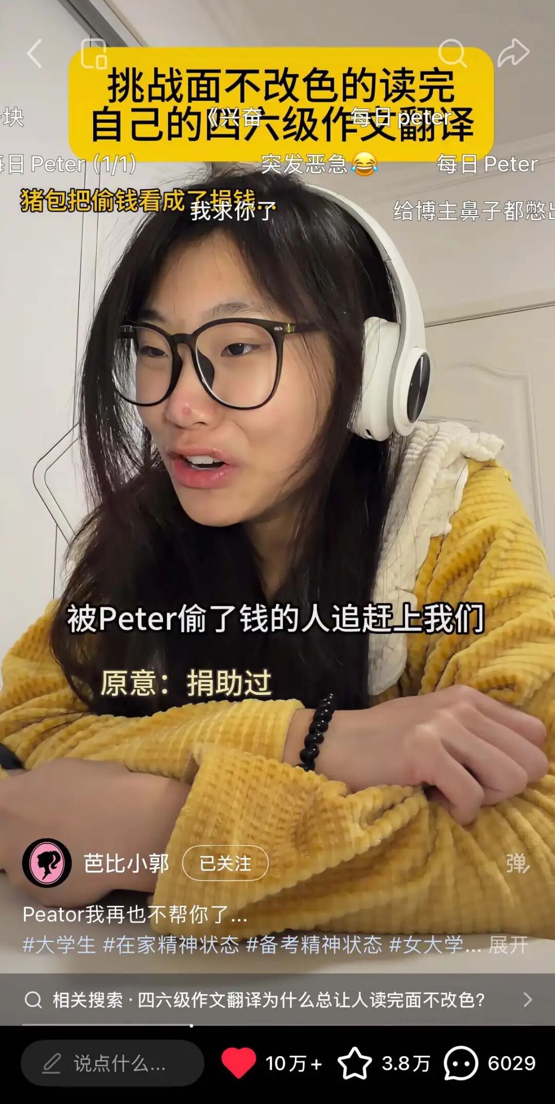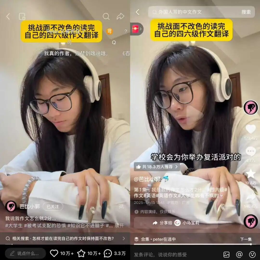 去年11月,她发布了第一条“挑战面不改色读四六级作文翻译”的视频,自此便成为Peter最严厉的母亲,将大洋彼岸的Peter玩弄于股掌之间。