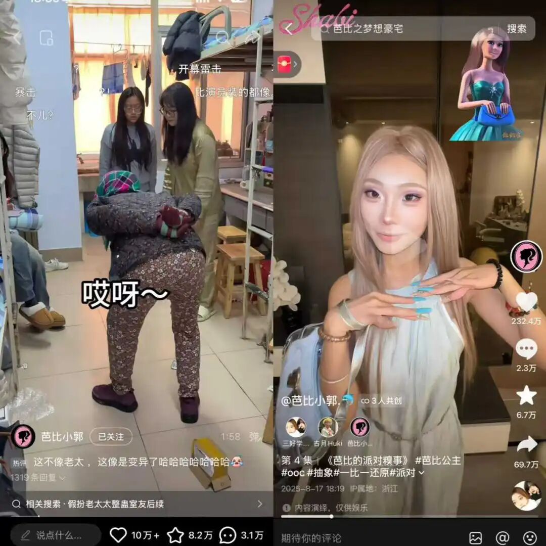 新榜编辑部观察到,“芭比小郭”是一位在校大学生,从2024年开始更新视频,大多以搞笑剧情内容为主,比如假扮疯狂老太闯入宿舍,和其他博主复刻《芭比公主》等,也产出了不少点赞量破百万的爆款。