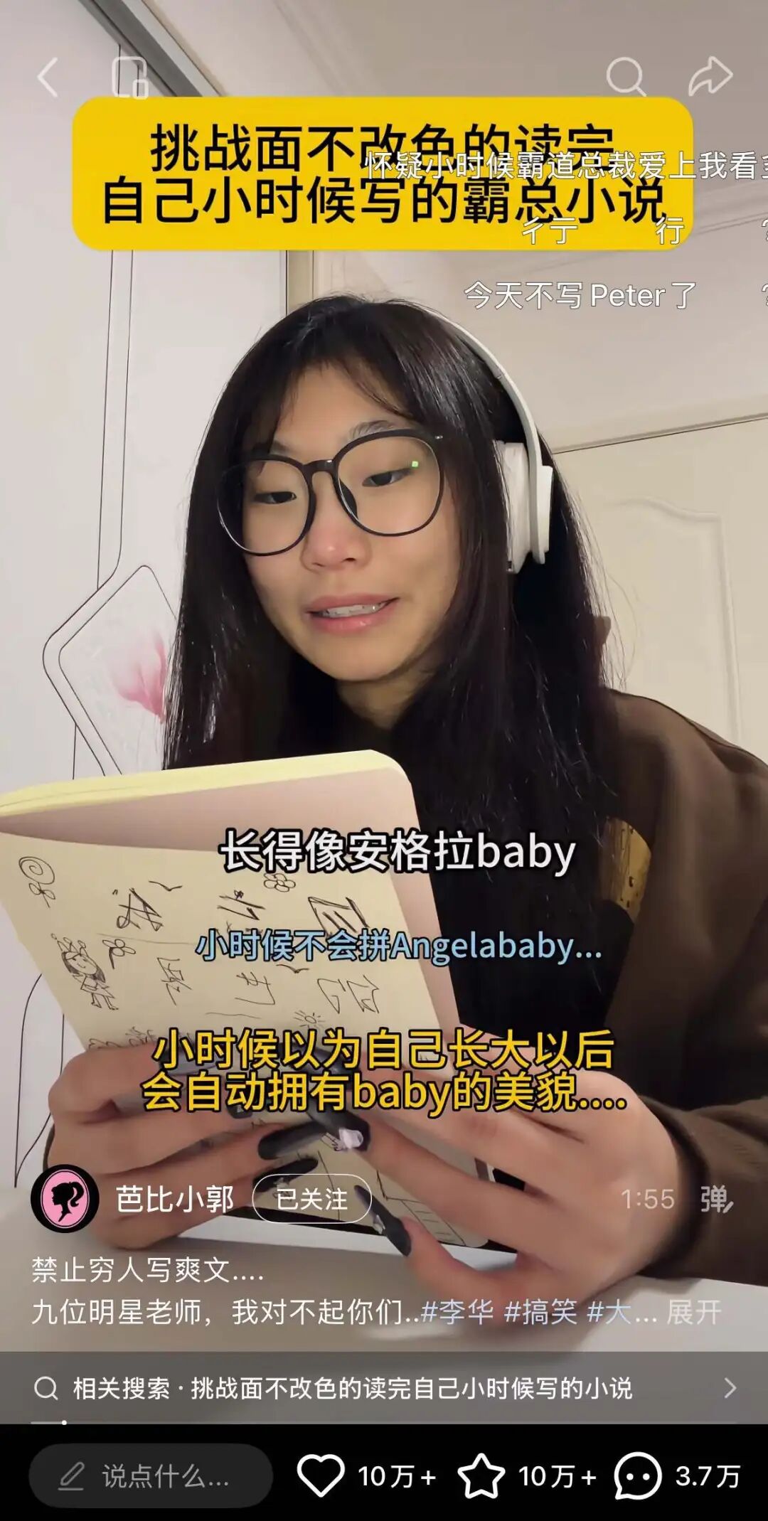 躺枪的不只有Peter,“芭比小郭”还将手伸向了小时候写的霸总小说,依旧大声憋笑朗读。