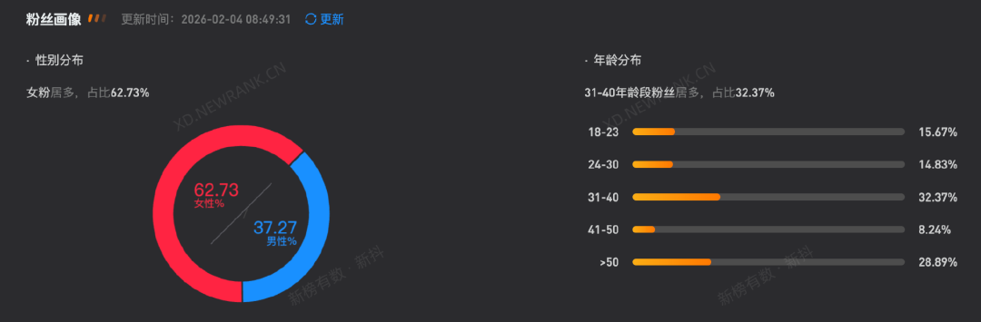 新榜数据显示,其小红书粉丝中女性占比近9成,18岁以下粉丝占比3成,而抖音粉丝中,女性占比6成,31岁-40岁粉丝占比3成。