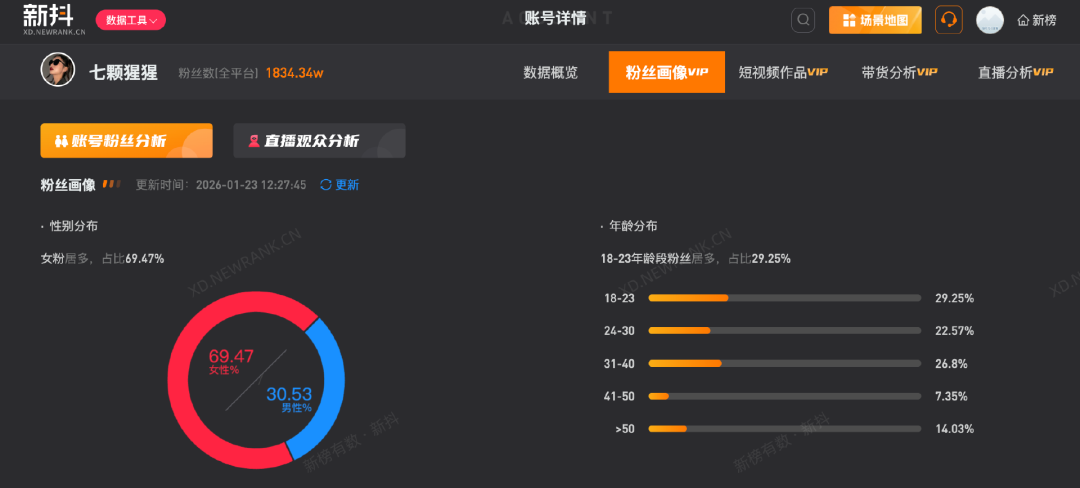 “七颗猩猩”抖音粉丝的年龄分布相对均衡,图源新抖
