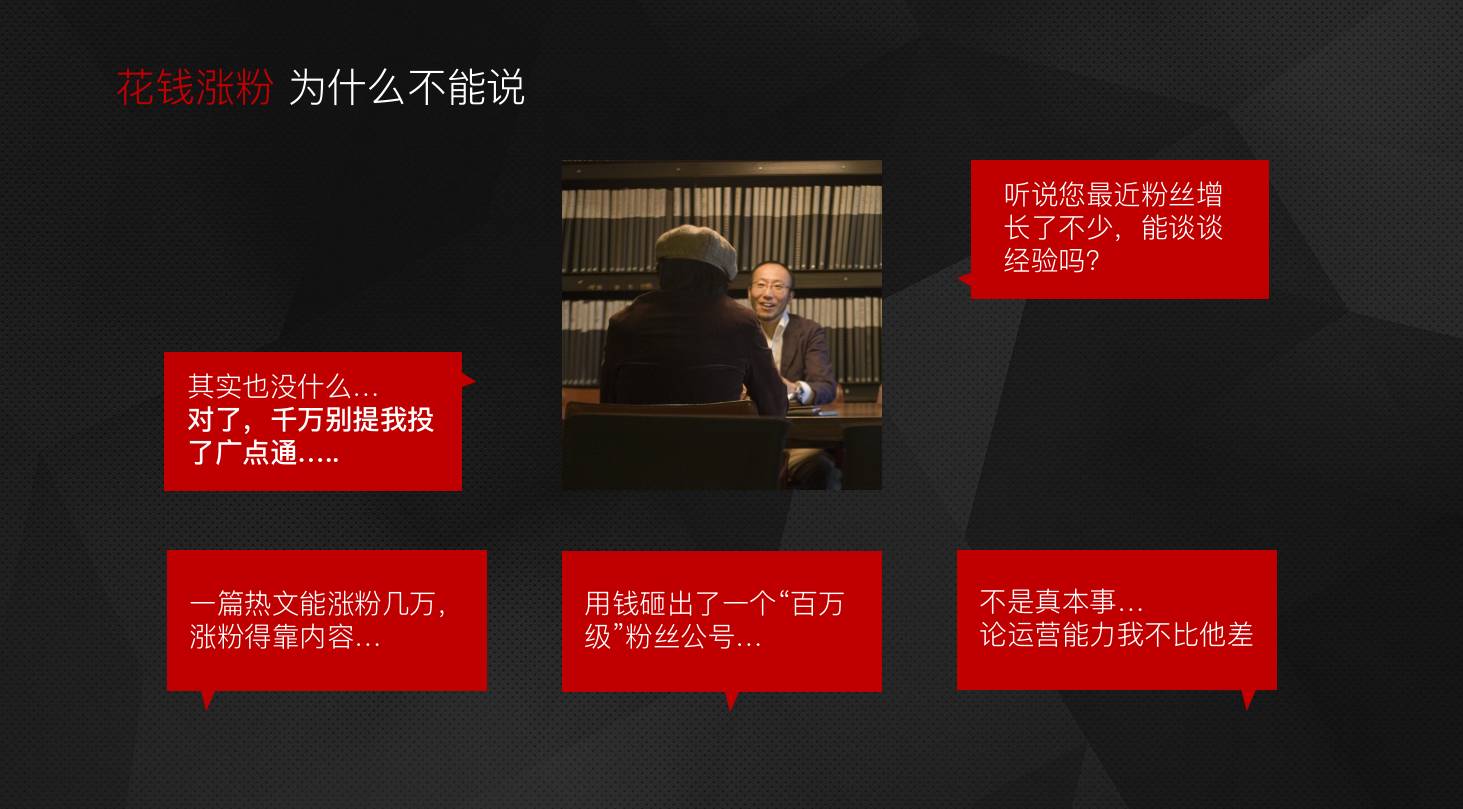在过去一年当中,很多自媒体向我问了一些利用营销方式涨粉非常核心的问题,我先从几个问题切入,和大家大致解释一下。很多自媒体说,用社交广告进行涨粉不就是买粉吗?其实花钱涨粉和买粉是不同的概念。花钱涨粉是利用社交广告这种平台方式,从兴趣导向、品牌营销的角度,实现真实的粉丝增长。