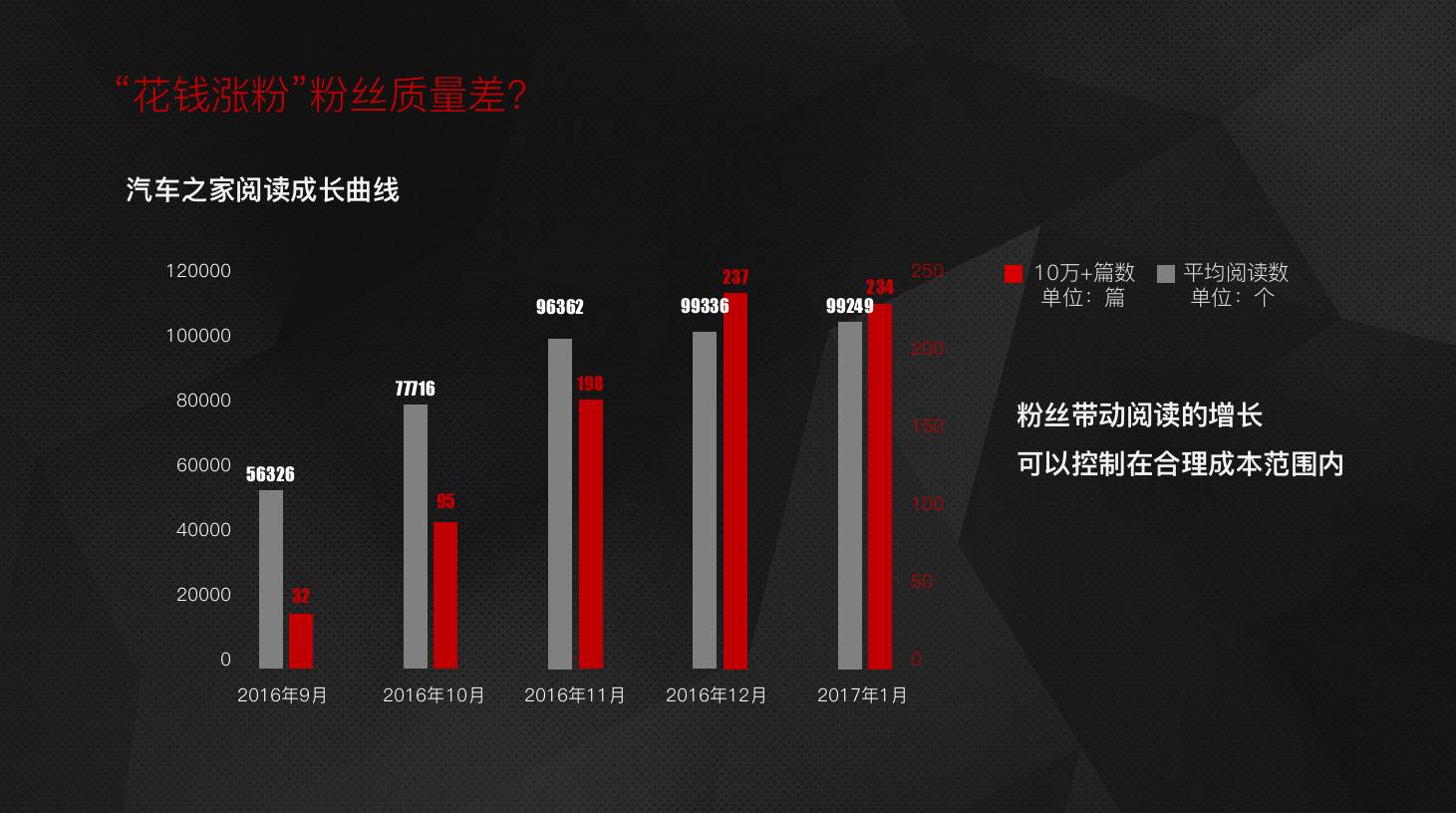 通过去年我们操作的一些案例来看,的的确确是真实粉丝的增长,而且带动了公众号无论阅读量还是活跃量的增长都是很显著的。买粉没有意义,和花钱涨粉两个概念,希望更多公众号可以区分开看待。另外,去年我们也听到了一些比较零散的声音,比如,某些公众号做社交化广告做得非常成功,获取一个粉丝的成本差不多是2元左右,但是同时我们也听到了一些其他的声音,说去年利用社交广告的方式涨粉的红利期已经结束了,现在一个粉丝的获取成本已经高达10元。到底是不是呢?在我们做的一些案例中,有的公众号的确成本很高,但是一定是从它自己运营的角度,或者其它方面的原因。但是我们发现更多的公众号的成本是完全可控的,我认为红利期已经结束这个结论为时尚早。