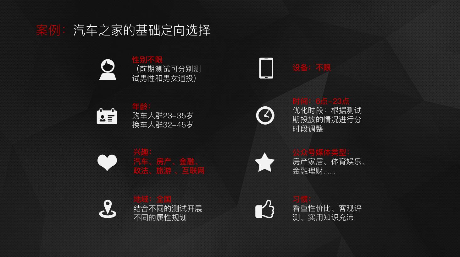 举个案例,“汽车之家”的基础定向。我们首先把人群大体上进行划分,比如前期测试,不分性别,男性女性都投。第二,在购车人群和换车人群上,我们也要做一个大体的区分。比如购车人群差不多是23—35岁之间,换车人群是32—45岁之间,基于不同的定向做不同的投放。第三,基于兴趣。对于汽车受众来说兴趣是什么呢?我们先要有大体的判断和假设。我们先人群定位,之后做更多的测试实验。最后就是地域和时间、公众号类别、习惯等等方面,我们都在做初期的尝试。