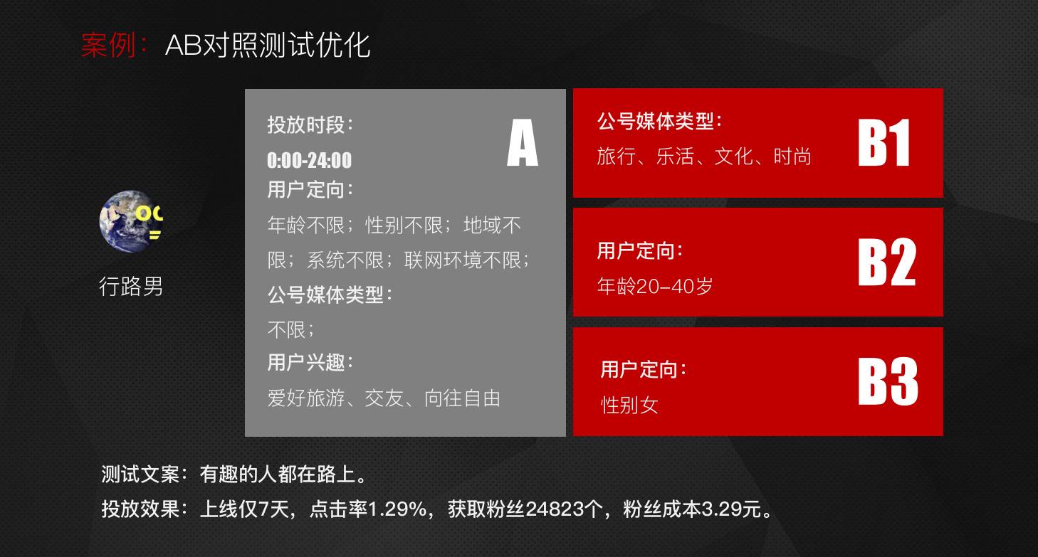这就是AB对照,我们利用“行路男”这个帐号,做了一个非常粗的定向。时间段不指定了,年龄也不指定,兴趣爱好大体指定一个方向。我们这个创意叫“有趣的人都在路上”,上线7天达到点击率1.29%,不算最低也不算最高,但是通过这个创意获取的粉丝是2.4万多个,成本控制得不错,大概是每个粉丝3.2元左右。这个过程当中我们特别想强调的一点,就是推广文案对运营内容提供的指引。我们用大量的创意海做了一个先锋,我这个创意跑成功了,产生了大量的用户或者粉丝,之后的内容就可以往这个内容上偏重了,这是一种良性的呼应关系。