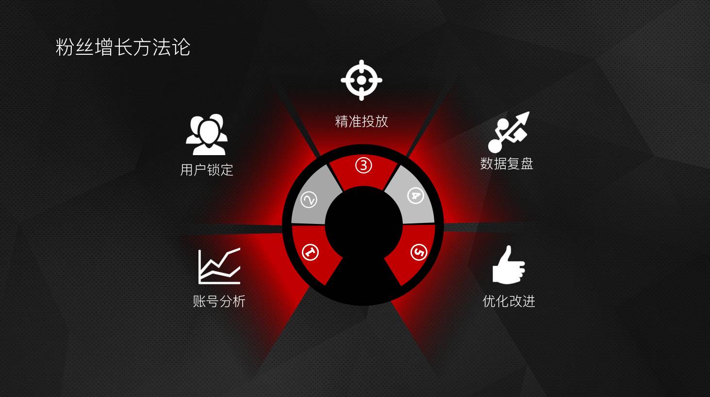 对于涨粉这件事,之前并没有非常通行的方法。我们去年也是不断地摸索,大体我们总结出五点。第一,需要对帐号进行全方位的分析。我们从粉丝、阅读等各个角度洞察公众号的运营现状;第二,用户的锁定。我们利用平台和标签,如定位标签、定向条件等,锁定我们的用户;第三,精准投放。精准投放有两个含义,不仅要求你的数据精准、定向精准,还要求你的创意精准,到底用这个创意有没有打动你需要的目标人群;第四,数据要不断地复盘。通过复盘找到并克服投放过程当中的问题点,只有这样才能提高效率,降低整体的粉丝获取的成本;第五,优化改进。接下来我会着重从这五个方面给大家详细介绍和阐释。