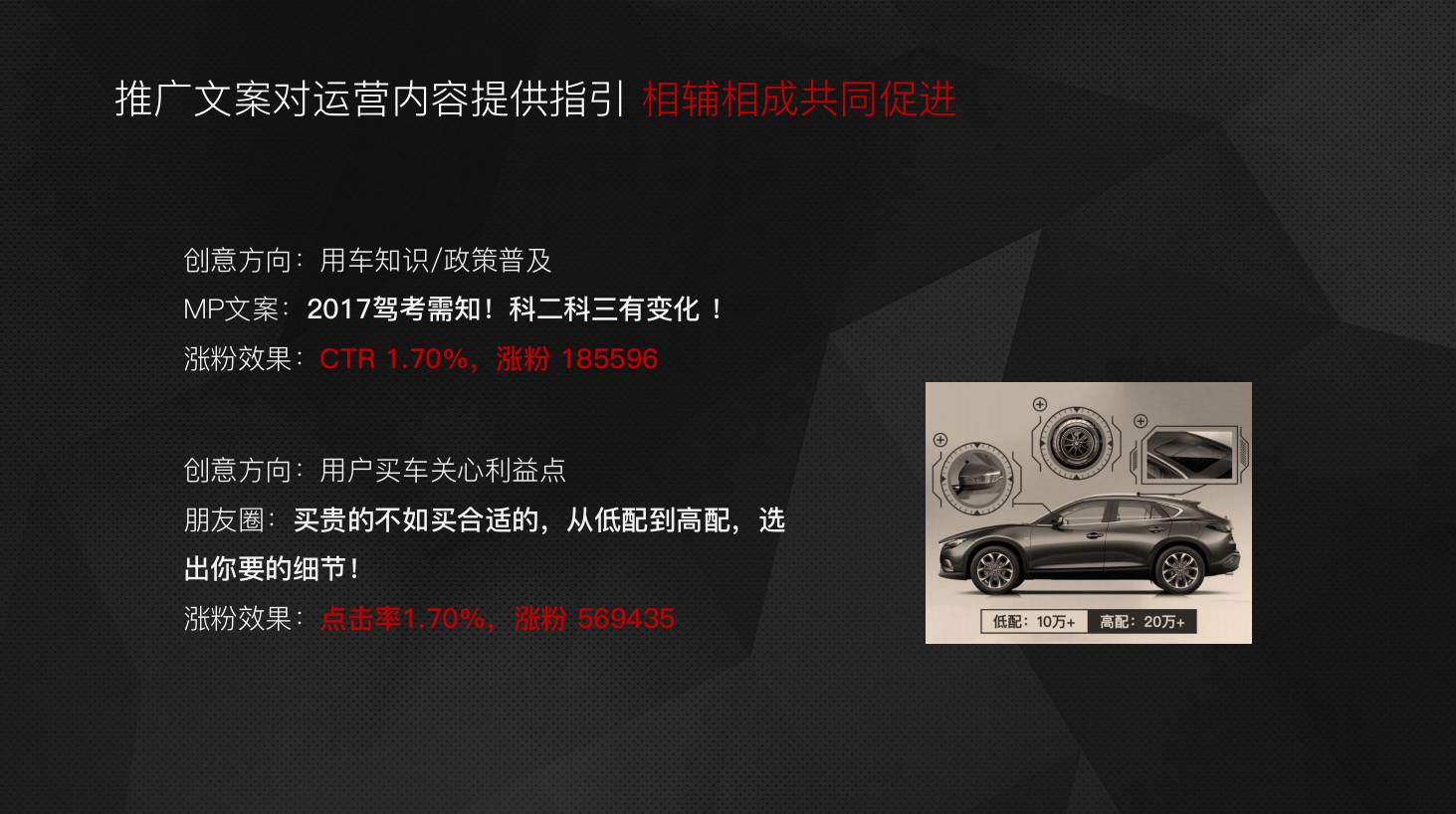 举两个例子。这是我们从用车知识和政策普及的角度做的创意。去年整个驾考在改革,我们抓住了一个热点事件,“2017驾考需知科目二科目三有变化”,很多人被吸引住了,这本身就是情境,点击率1.7%,涨粉18万以上。第二个创意方向,从买车关心的利益点角度,这是我们投的朋友圈广告——“买贵不如买合适,从低配到高配,选出你的细节”,点击率也达到1.7%,涨粉达56万。从情境和内容角度,我们跑出了两个比较好的创意。这两个创意完全是可以指导内容接下来的有力展开。对应公众号,粉丝不断优化,形成了内容强有力的出口,“汽车之家”无论官方还是公众号都在推送与这个主题相关的内容,这样会形成良性循环:通过好的创意带动了更多的粉丝,媒体平台又利用了这样的创意创造了更多的内容。