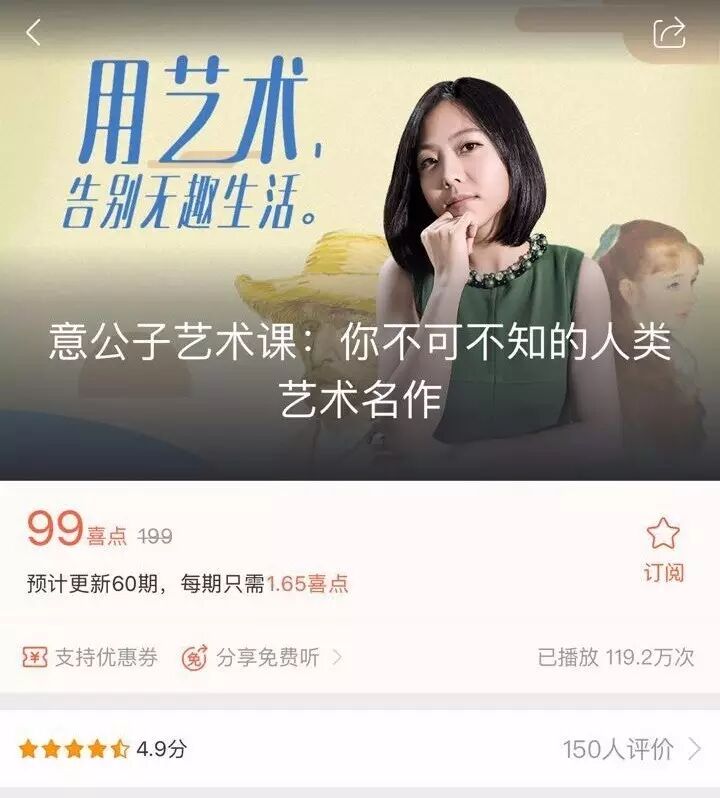2016年,意外艺术小试牛刀,推出的第一个付费内容产品《你不可不知的人类艺术名作》,喜马拉雅上线第一天,销售6684份,成交金额44万多。