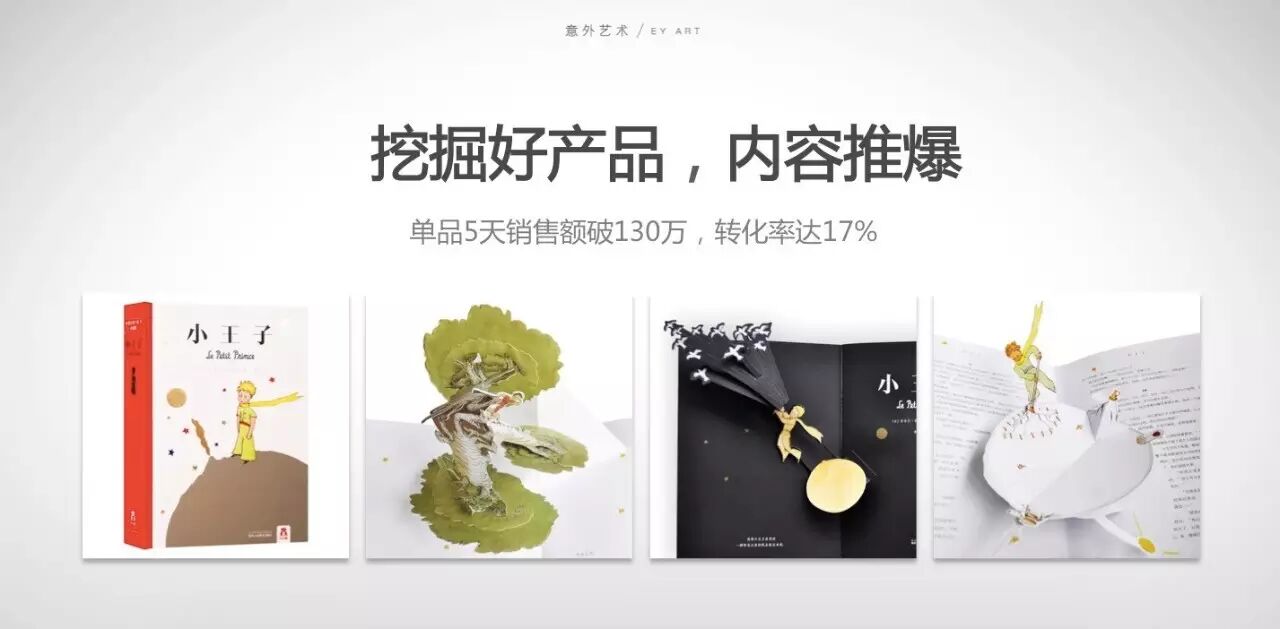 2016年7月,意外艺术推出一本手工立体书《小王子》,5天销售130多万元,转化率高达17%。