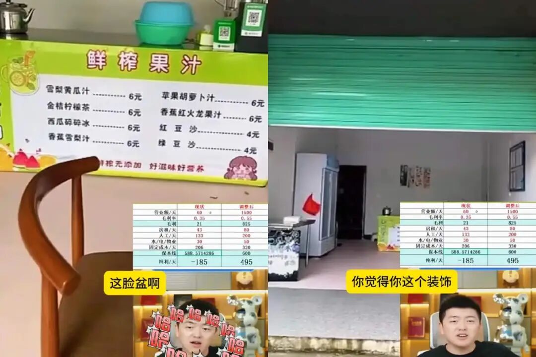 此人的战绩是,店铺选在蜜雪冰城旁边,认为蜜雪冰城“便宜没好货”,于是开鲜榨果汁店,店内只配了一个不锈钢柜子、一对桌椅,桌子上摆着做果汁用的脸盆。店铺一天营业额60元,自觉生意太少,于是斥资2万给杂牌加盟商交了学费。