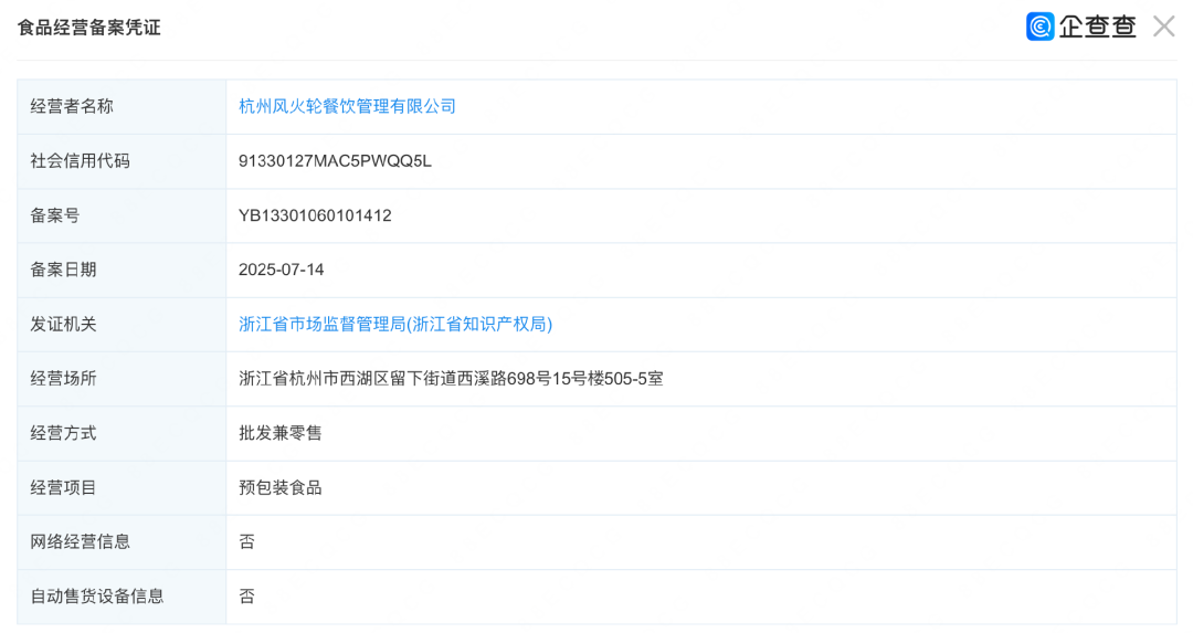企查查数据显示,“哪吒仙饮”品牌归“杭州风火轮餐饮管理有限公司”所有,这家公司于2022年成立,但在2025年7月才进行预包装食品备案。2024年企业年报显示,这家公司社保参保人数为0。