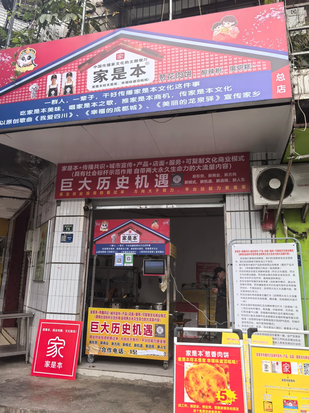 这位老板的开场便让人过目不忘:他的门头招牌上,“家是本”三个黑体大字占据C位,“巨大历史机遇”紧随其后撞入眼球,顾客得费劲从密密麻麻的文字里找出“葱花肉饼”“酸辣粉”等微弱的产品名。