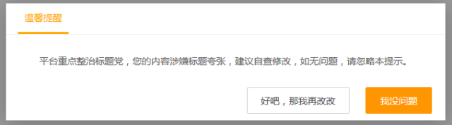 新榜讯 近日,UC订阅号上线标题党检测机制,即当订阅号作者完成创作后,在提交文章环节,标题党检测机制会对文章标题进行判断,如果发现疑似标题党,则会提示自媒体人标题涉嫌夸张,要求自行检查。后续,UC云观团队也会加大力度,持续严厉打击涉及标题党等违规行为,情节严重将会对账号进行永久封禁处理。