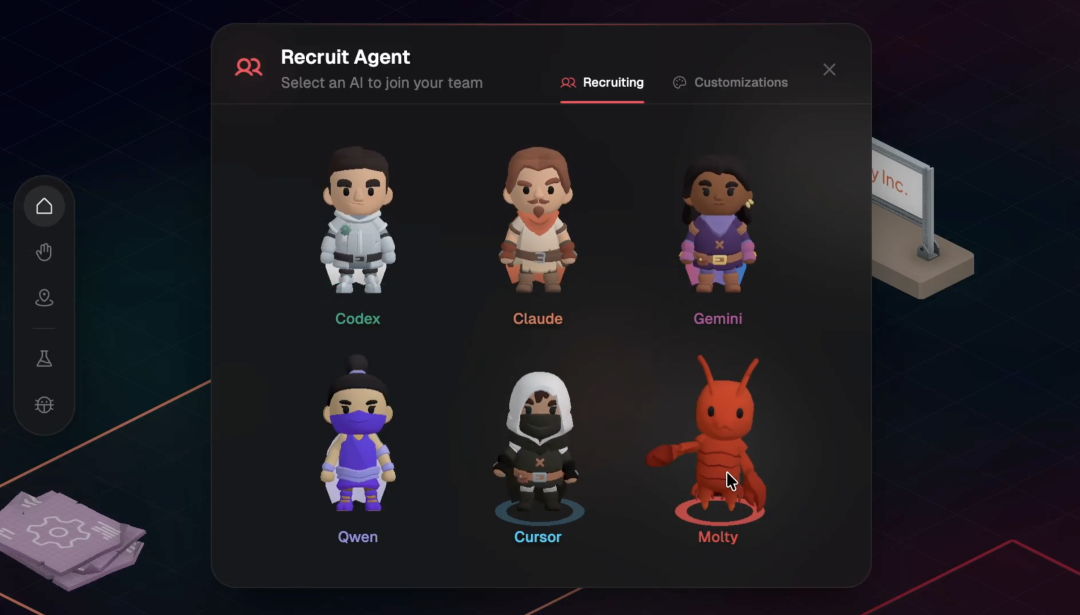 AI模型都变成了可爱的卡通小人形象,你可以从“招募板”上选择不同的AI模型和开发框架加入团队,比如Claude、Gemini、Qwen等。整个界面看起来像在玩游戏,小人们工作的样子就像在开会、围观、讨论。