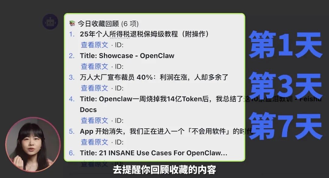 为了进一步提升知识转化率,你还可以结合艾宾浩斯遗忘曲线,让OpenClaw在你收藏后的第一天、第三天、第七天等关键节点自动推送回顾提醒。
