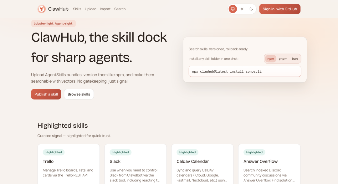 但其实需要创建或安装特定的Skill,它才能学会新技艺。目前,有两个主流的获取热门Skill的渠道,一是去OpenClaw专属的技能插件市场ClawHub,另一个则是去GitHub挖掘。