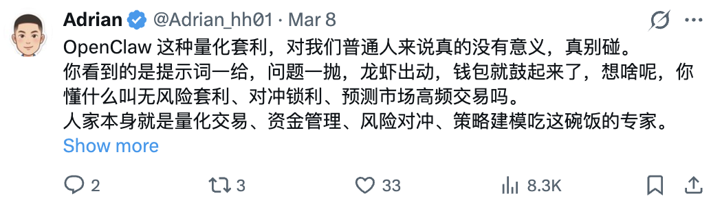 不过,真实情况是加密交易本身高风险,虽然有社区案例确实赚到几百到几千刀,但盲目给AI大额资金交易非常危险。如果你对OpenClaw感兴趣,建议从办公 / 个人效率场景开始玩,量化套利这种高难度玩法,普通人慎入。