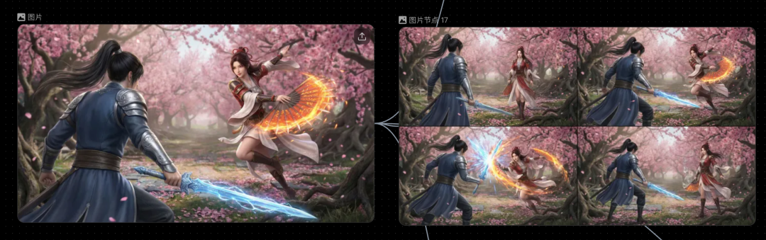 过去我们在不同页面和工具间来回倒腾垫图、修改提示词的繁琐操作,在这里被简化成了顺畅的节点连线。如果对分镜图不满意,单击图片即可修改提示词重新生成,最终成片完成度很高。