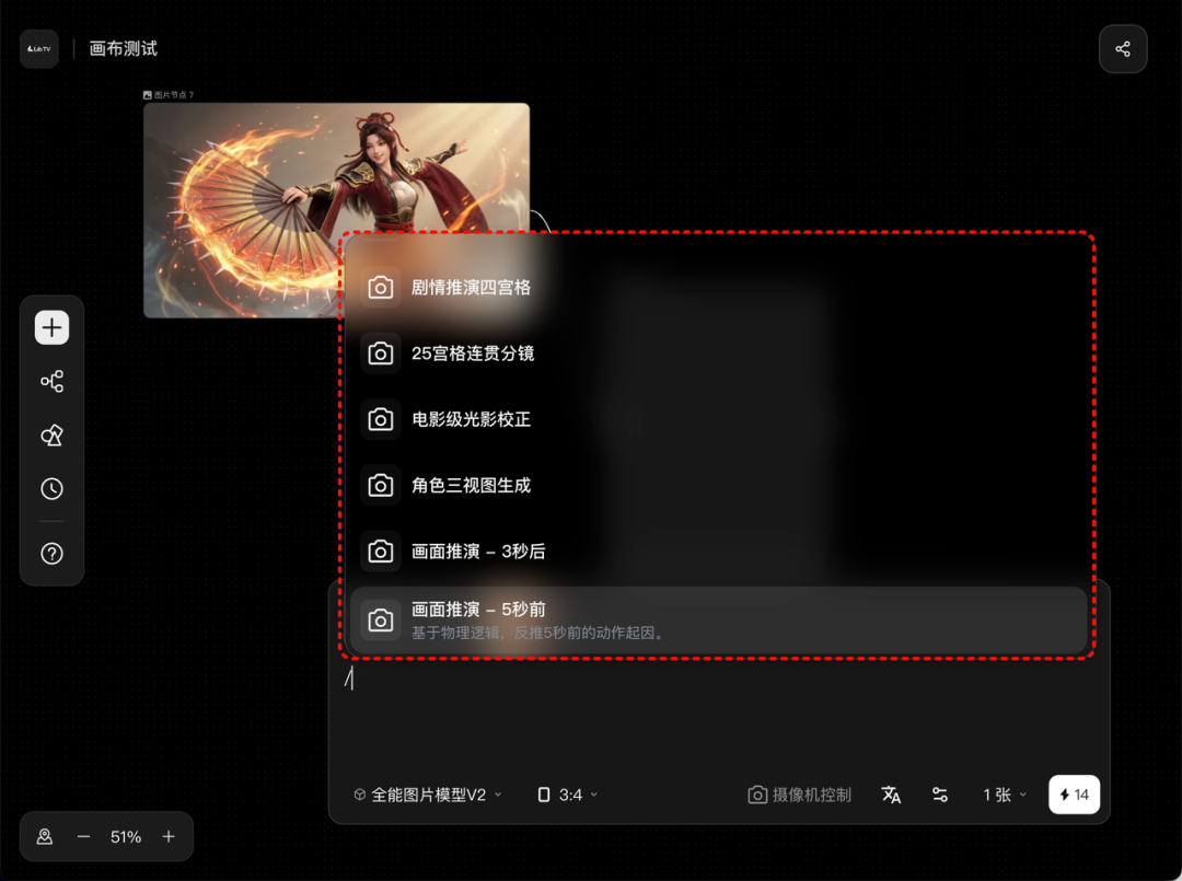 目前LibTV已经上线了20多个高频使用的专业视频创作功能,其中多项为行业首次推出。在图像生成器中(有参考图时),支持通过输入/符号快速调用。