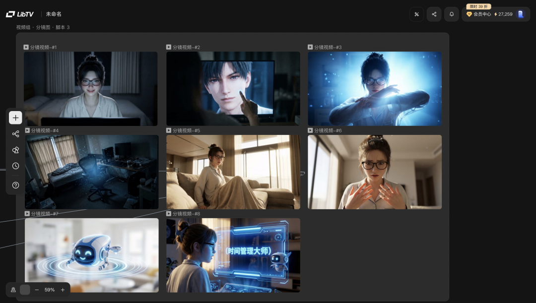 整个创作过程完全在LibTV的无限画布上展开,LibTV支持通过描述剧情,或者上传剧本、角色图像、参考视频,直接生成脚本,并通过脚本直接批量生成分镜图和视频。