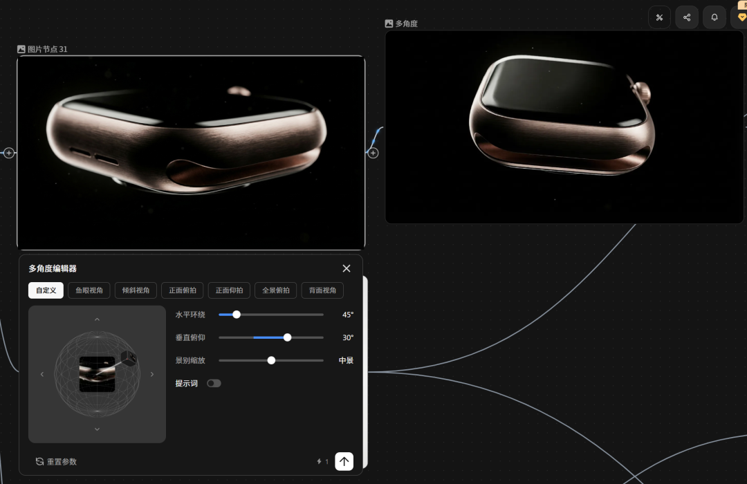 比如这个多角度编辑器,我们想给手表表盘换一个角度,只要拖动摄像头位置,就能快速修改水平、垂直、景别等参数,生成的图片还能保持高度一致性。