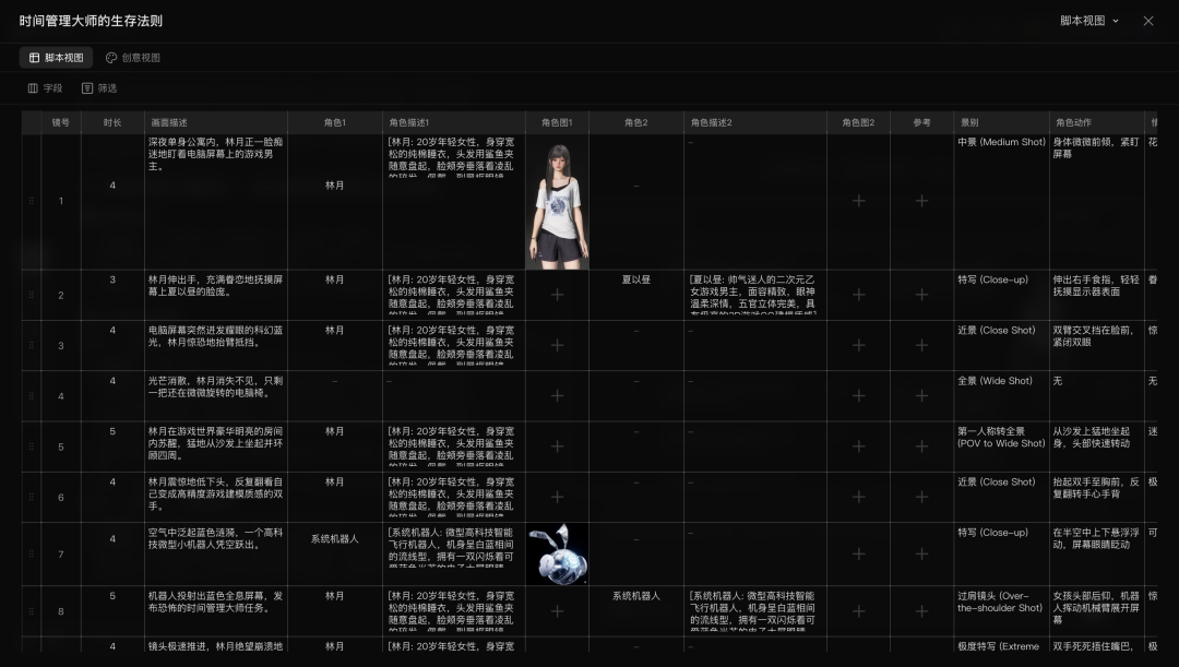 在LibTV的脚本视图界面,时长、画面描述、具体的角色设定、景别和镜头动作都得到了详细拆解,你还可以给每个分镜上传参考图,比如我们为女主林月设定了穿着宽松睡衣、戴着黑框眼镜的居家宅女形象。