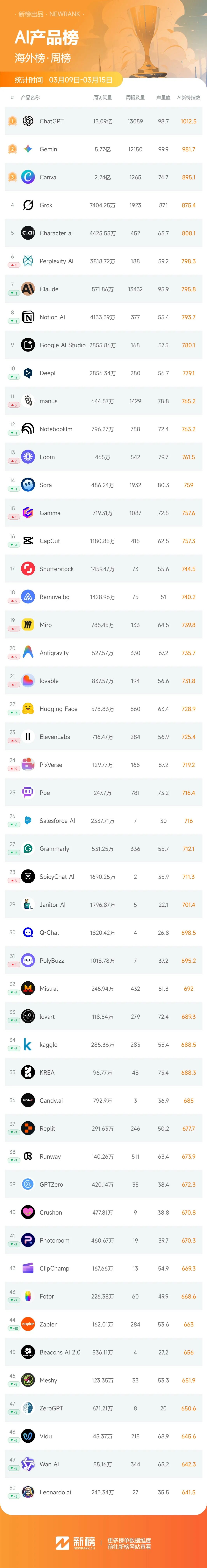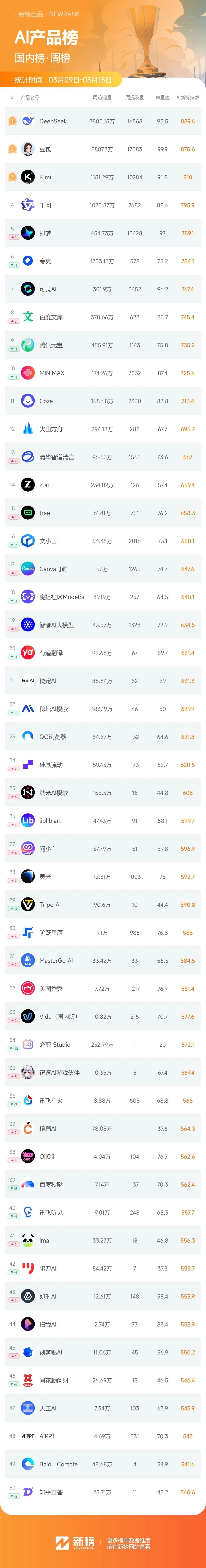 欢迎关注「AI新榜-AI产品榜」,这是由新榜出品的榜单产品,包含月榜和周榜。本期为第78期周榜,统计时间为2026年3月9日-2026年3月15日,榜单分为总榜、国内榜、海外榜。
