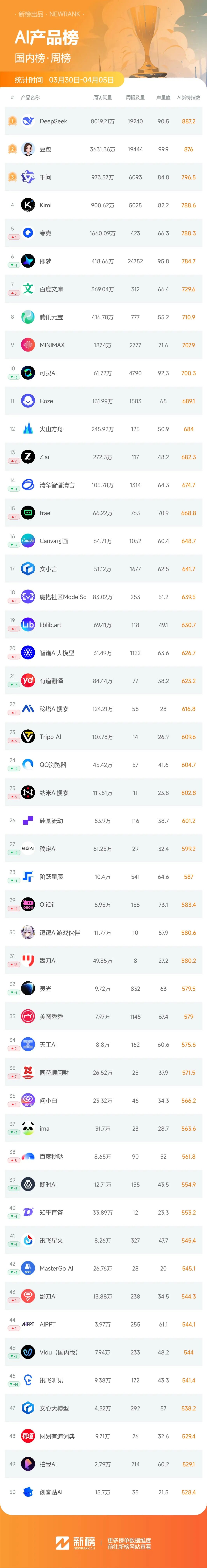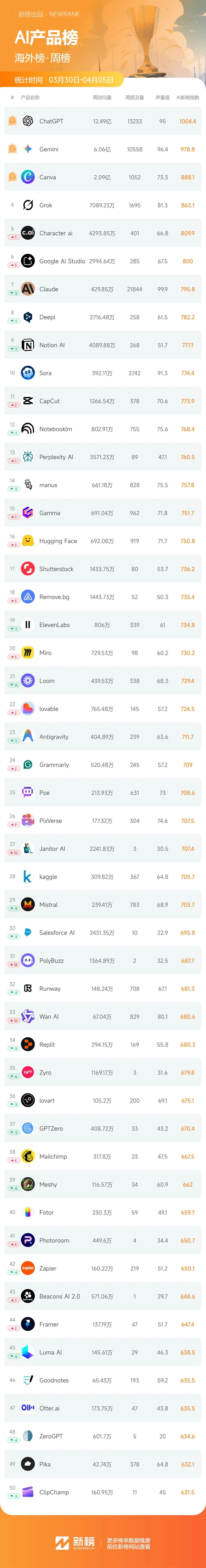 欢迎关注「AI新榜-AI产品榜」,这是由新榜出品的榜单产品,包含月榜和周榜。本期为第81期周榜,统计时间为2026年3月30日-2026年4月5日,榜单分为总榜、国内榜、海外榜。