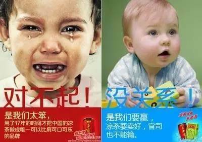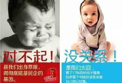 自加多宝与王老吉分家之后,两家的互掐从来没有停止过。因红罐之争,王老吉胜诉,加多宝赔了1.5个亿。加多宝出了一个“对不起”体,王老吉又用一个“没关系”体作为回应。这自嘲的功力,这感情牌打的我都快哭了!