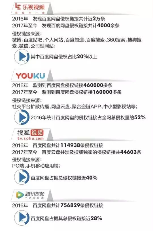 百度网盘在其中的作用尤为突出。据第三方不完全统计,2016年优酷、搜狐、腾讯、PPTV、乐视等网络视频平台,合计处理百度网盘的侵权链接140多万条。百度网盘“秒传”分享功能,以及其仅删除盗版链接的行为,更被质疑为盗版传播提供了“温床”。