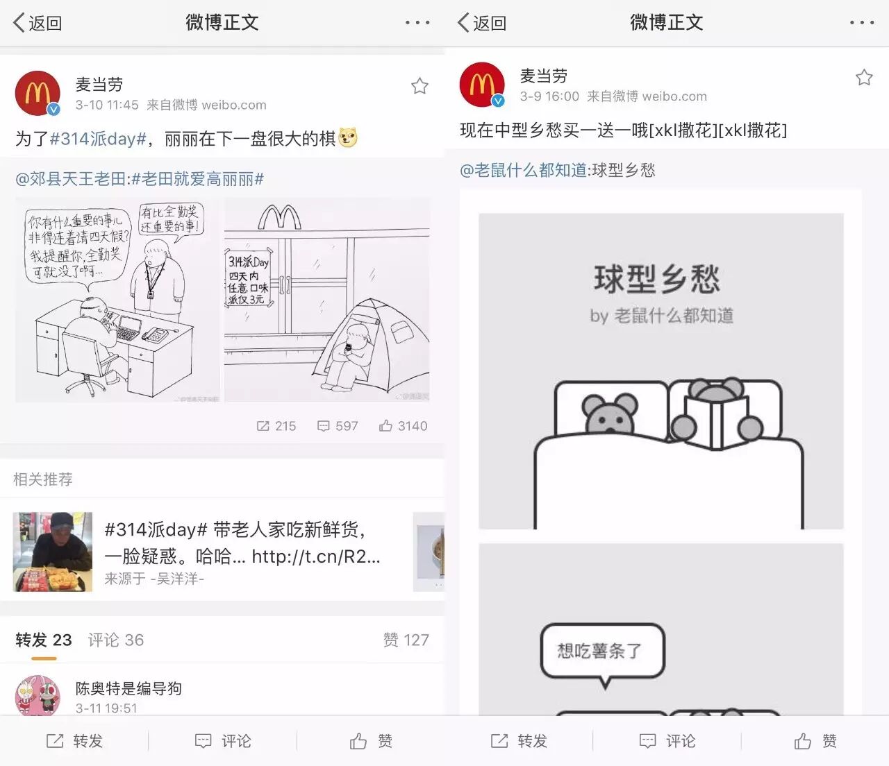 不仅如此,麦当劳也与一些小众的漫画自媒体合作进行品牌推广。比如@老鼠什么都知道 创作的《球型乡愁》;@郊县天王老田 的#老田就爱高丽丽#。